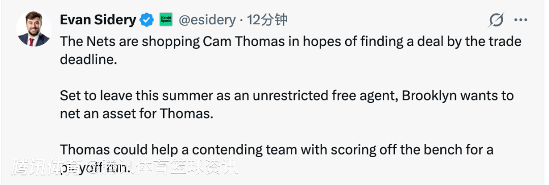 由于托马斯将在今年夏天成为完全自由球员,篮网希望在他身上换回一些资产回报。托马斯可以为一支有竞争力的球队提供板凳得分火力,助力球队冲击季后赛。