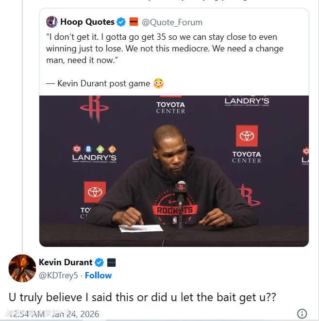 一个球迷转发虚假言论时写道:“说真的,在我看来,在交易来杜兰特之前, 火箭是更有竞争力的冠军争夺者。现在他们患上了‘杜兰特救世主情结’。”