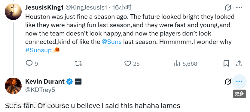 杜兰特也回复这位球迷:“太阳队的球迷啊。难怪你会信这种话是我说的,哈哈,真没劲!”