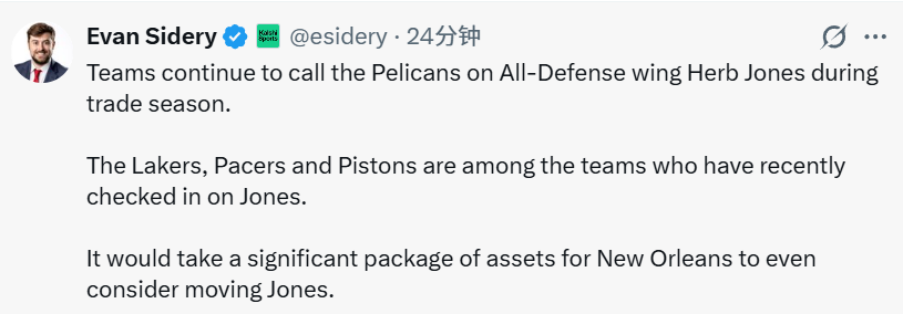 北京时间1月24日,据名记Sidery报道,交易窗口期,多支球队持续向新奥尔良鹈鹕队询价全明星级防守侧翼赫伯特-琼斯。