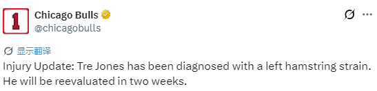 北京时间1月24日,公牛官方发布公告,宣布球队后卫特雷-琼斯确诊左腿筋拉伤,将在两周后接受复查。