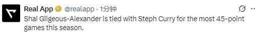 亚历山大此役得到了47分,根据数据统计显示,这是亚历山大本赛季第3次单场砍下至少45分,追平了斯蒂芬-库里,并列排在联盟第一位。