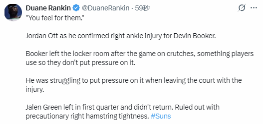 在谈到杰伦-格林和德文-布克的伤病情况时,奥特说道:“杰伦还是老样子,只是感觉腿筋有点发紧,出于预防考虑把他换下场了,没再回来。等回到凤凰城,我们会对两人都做进一步评估。布克的情况你们也看到了,右脚踝扭伤,踩到了别人的脚上,挺倒霉的。等回到凤凰城再仔细检查一下。”