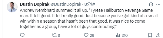 在谈到这场胜利时,内姆布哈德说道:“这是为哈利伯顿复仇的一场比赛。感觉太棒了,真的太棒了。在这个并不算顺利的赛季里,能拿下这样一场小小的胜利,意义非凡。全队团结一心,很多球员都站了出来,这种感觉真好。”