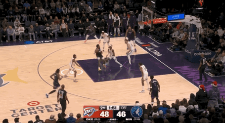 兰德尔最后时刻造成犯规2罚1中,但是森林狼把握前场篮板,爱德华兹命中三分,森林狼最后37.8秒重新反超雷霆1分。亚历山大回头突破被封盖,杰伦-威廉姆斯投丢反超三分,雷霆只能战术犯规送兰德尔上罚球线,后者2罚全中,森林狼处于常规时间不败之地。