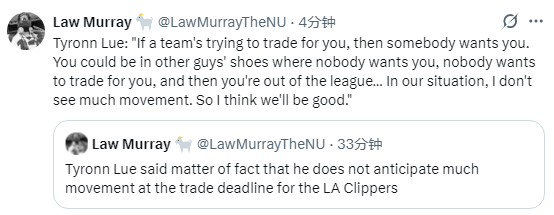 泰伦-卢直言,他认为快船在本次交易截止日前不会有太大的阵容变动。泰伦-卢表示:“如果有球队想要交易得到你,说明有人认可你的价值。你不妨换位思考,若是没人想要你、没人愿意通过交易得到你,那你可能就会淡出联盟。就我们球队的情况而言,我认为不会有大的人员调整,所以我觉得我们现有的阵容就足够出色。”