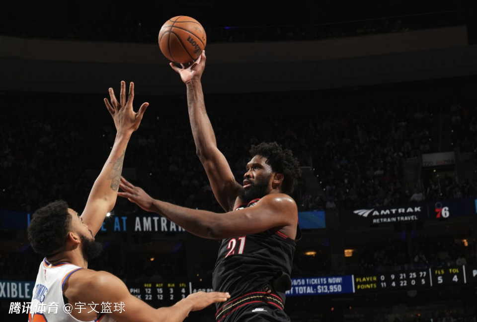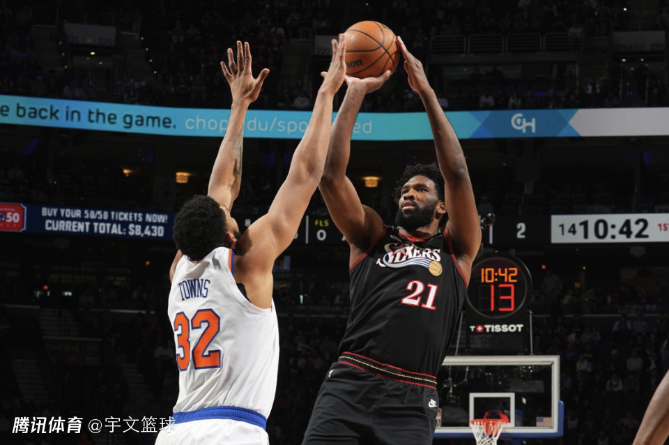 末节比赛,尼克斯逐步扩大领先优势,最多拉开分差到17分,恩比德甚至出现2罚不中的尴尬情况。但他很快调整自己状态,以一记三分为76人及时止损,利用自身牵扯能力为队友创造得分机会,并且禁区果断上篮打进2+1。在恩比德的带领下,76人打出一波20-6的进攻高潮,一度将分差追到3分。