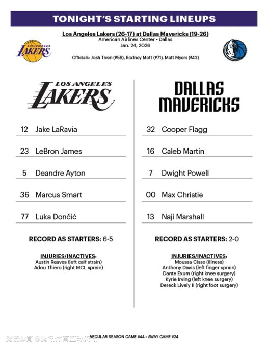 北京时间1月25日,NBA常规赛继续进行,湖人对阵独行侠。赛前,两支球队分别公布本场比赛首发名单。湖人方面,东契奇和詹姆斯联袂首发,独行侠方面弗拉格带队应战。