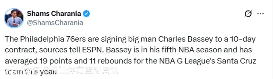 北京时间1月25日,据美记Shams报道,76人将与查尔斯-巴锡签下一份10天合同。巴锡目前正处于他的第5个NBA赛季,此前他曾为灰熊打了2场比赛。