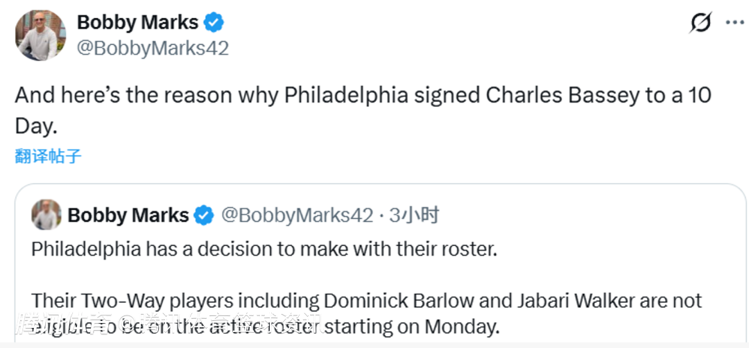 随后薪资专家Marks也解析了76人为何要签下巴锡,因为他们的双向球员,包括巴洛和贾巴里-沃克,从周一开始将不再有资格进入激活名单。