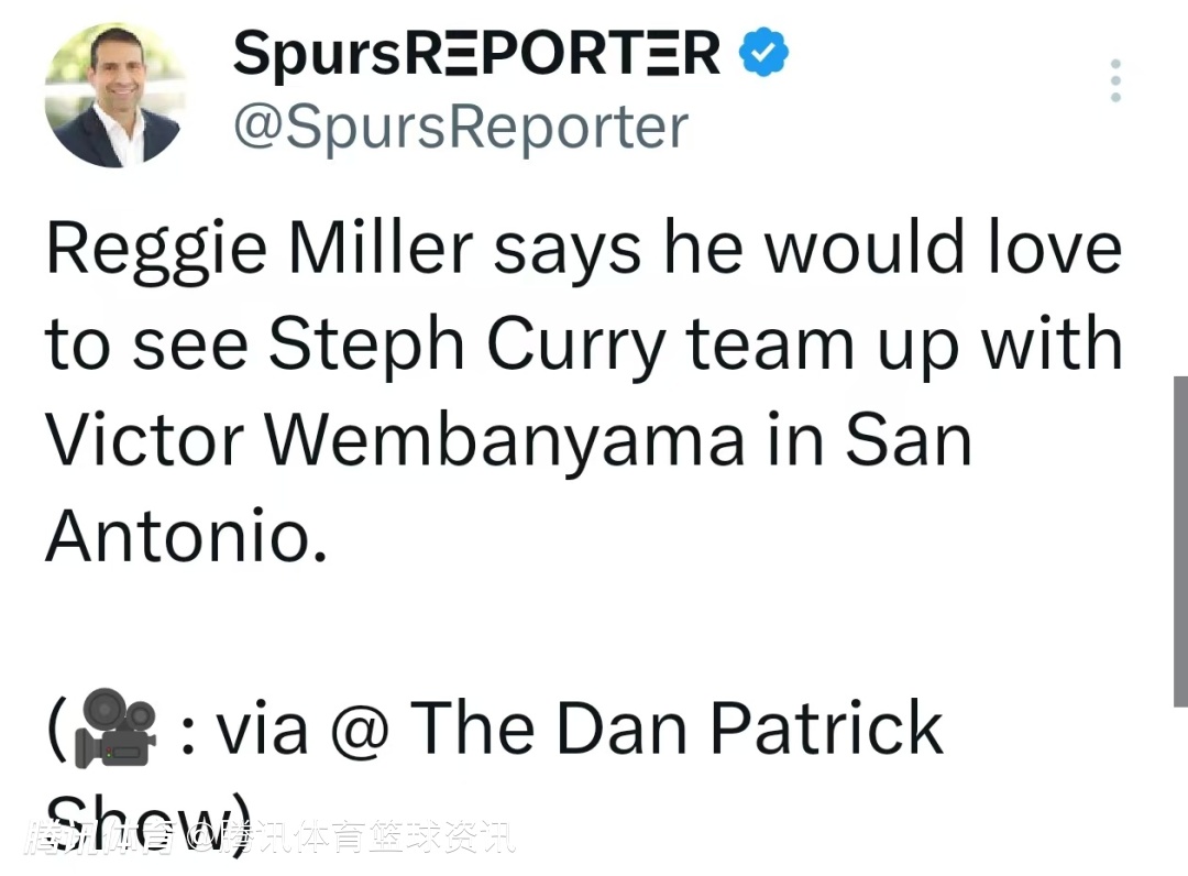 北京时间1月25日,NBA名宿雷吉-米勒在直播节目中表示,他很期待看到库里和文班在马刺联手。