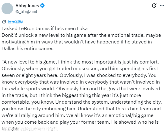 当被问到是否觉得东契奇在交易之后,赛场表现迎来了全新高度,詹姆斯表示:“要说赛场表现的全新高度,我觉得最关键的还是他如今的融入感。很明显,赛季中期突然被交易,而他前七八年的职业生涯都扎根在这里,这事不管是对交易的当事人,还是对整个体育圈的所有人,甚至圈外的人,都倍感意外。但我觉得他今年最大的变化,就是彻底放得开了。他吃透了球队的战术体系,熟悉了这座城市,而这座城市也真心接纳了他。他更清楚了,这支球队就是属于他的队伍,我们所有人也都一心围着他打拼。重回旧主的赛场打球,这场比赛注定情绪拉满、意义非凡,而他今晚的表现,正是他实力的最好证明。”