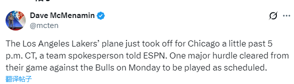 湖人随队记者Dave McMenamin报道,湖人队发言人透露,球队专机已经成功起飞前往芝加哥;Stein补充报道,湖人航班的起飞机场从洛夫菲尔德机场改为达拉斯沃斯堡国际机场,此前独行侠的航班在洛夫菲尔德机场滞留数小时后最终被取消。