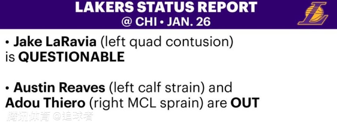 根据赛程,湖人将于明日上午9点客场挑战公牛,湖人官方更新最新伤情报告,拉拉维亚因股四头肌挫伤本场比赛出战成疑,里夫斯将继续因伤缺席。