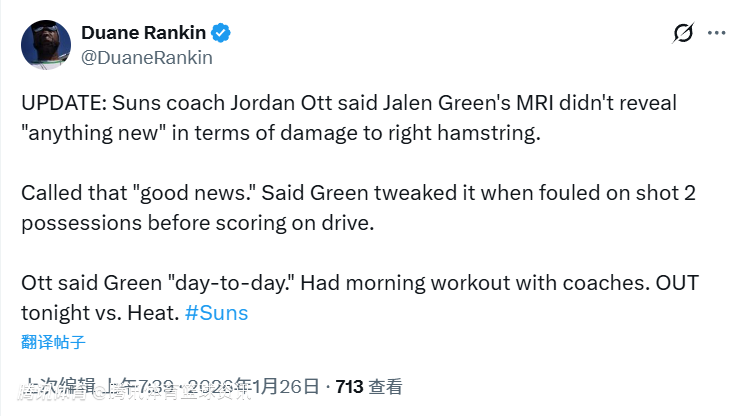 北京时间1月26日,NBA常规赛继续进行,太阳对阵热火。赛前,太阳官方确认杰伦-格林(伤病管理)将缺席本场比赛。