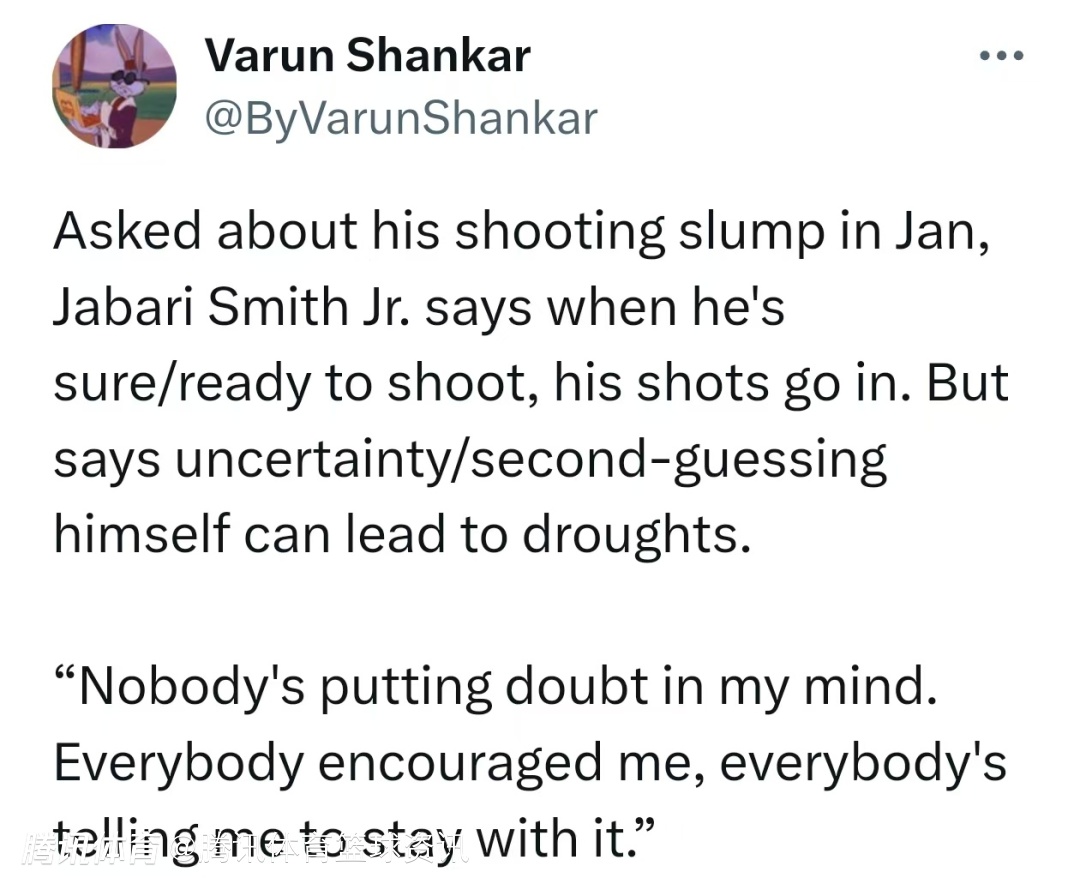 小贾巴里表示,投篮能否命中的关键在于出手时的坚定心态,只要自己确信准备就绪,球就能投进;而犹豫不决或是自我怀疑,正是导致近期投篮不顺的原因。