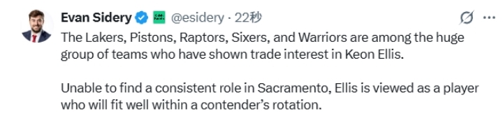 北京时间1月26日,根据NBA记者Evan Sidery报道,湖人队、活塞队、猛龙队、76人队和勇士队,都对基恩-埃利斯表现出交易兴趣。