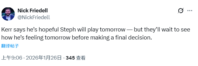 北京时间1月26日,NBA常规赛继续进行,勇士队111-85大胜森林狼队。库里此役18投7中得到26分7助攻,赛后,勇士队主教练科尔接受媒体采访,谈到了库里的情况。