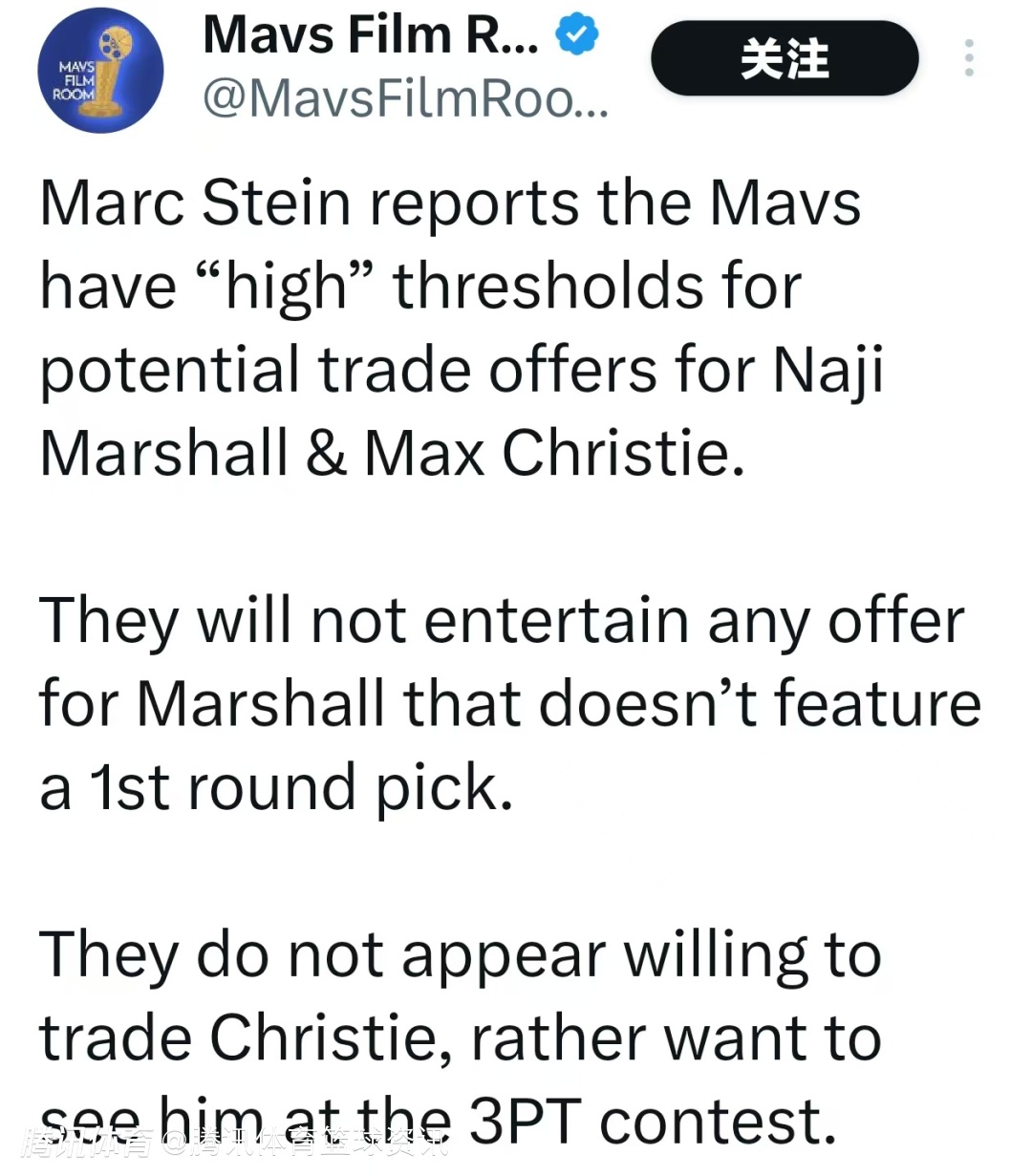 北京时间1月27日,据名记Marc Stein报道,独行侠对马绍尔和克里斯蒂的潜在交易报价设置了极高的门槛。