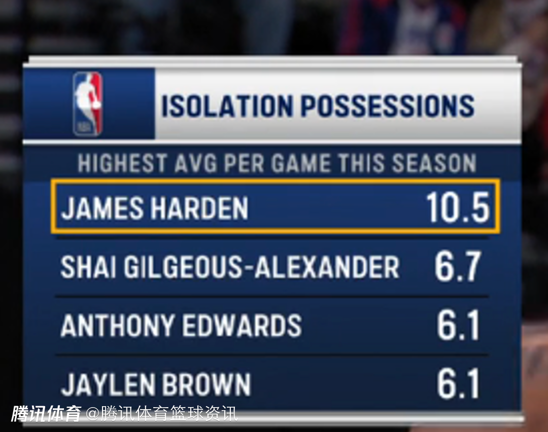 本场比赛,前方的转播镜头也给到了哈登本赛季的一则数据,他的场均单打次数断层第一,以10.5次排在全联盟第一,而第二位的亚历山大才只有6.7次,其次则是爱德华兹和杰伦-布朗的6.1次。