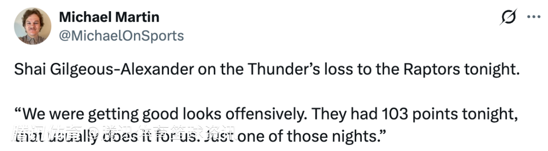 亚历山大表示:“感觉我们本该掌控比赛的。我们在进攻端获得了不少好机会,他们今晚只得了103分,这个分数通常对我们来说是足够赢下比赛的。只能说今晚就是那种不走运的夜晚。”