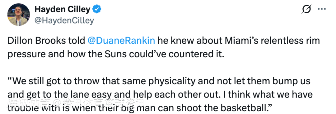 狄龙表示,他知道热火会持续冲击篮筐,也清楚太阳本可以如何应对:“我们必须用同样强硬的身体对抗回应,不能让他们轻松突破到禁区,并且要互相协防。我觉得我们最大的问题是,当他们的大个子球员能投篮时,我们就很难应对了。”