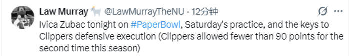 在谈到有球迷此前曾在社交媒体上表示“如果快船本赛季能够在任意阶段取得15胜3负,他将打印并吃掉推文”的话题时,祖巴茨表示:“吃推特,这很有意思,我就是想看视频,希望这事真发生,到时候有人能给我发个链接。”