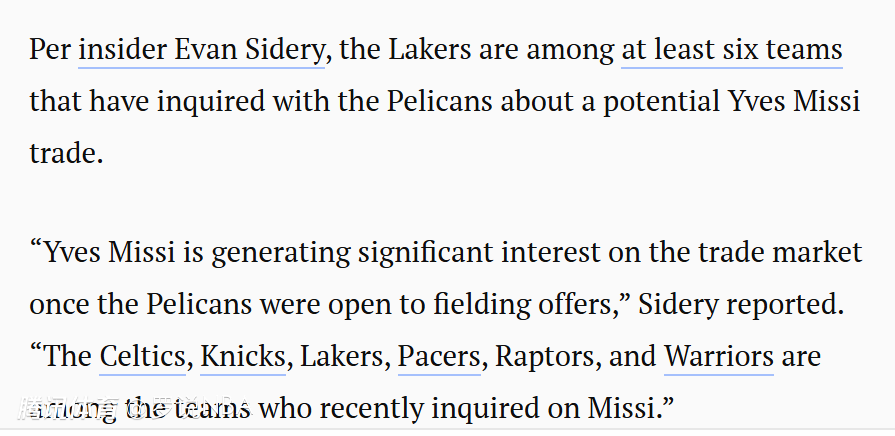名记Sidery表示,湖人队是已向鹈鹕队询价米西的至少六支球队之一。