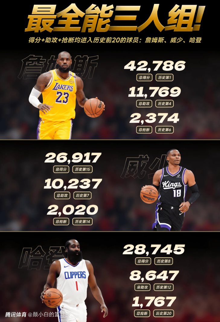 现役也只有三人得分、助攻、抢断进入前20,这三人分别是:詹姆斯、威少、哈登。