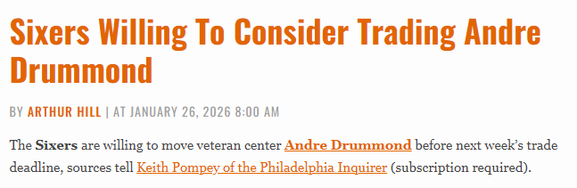 北京时间1月27日,据记者Keith Pompey报道,76人有意在下周交易截止日前送走老将中锋安德烈-德拉蒙德。