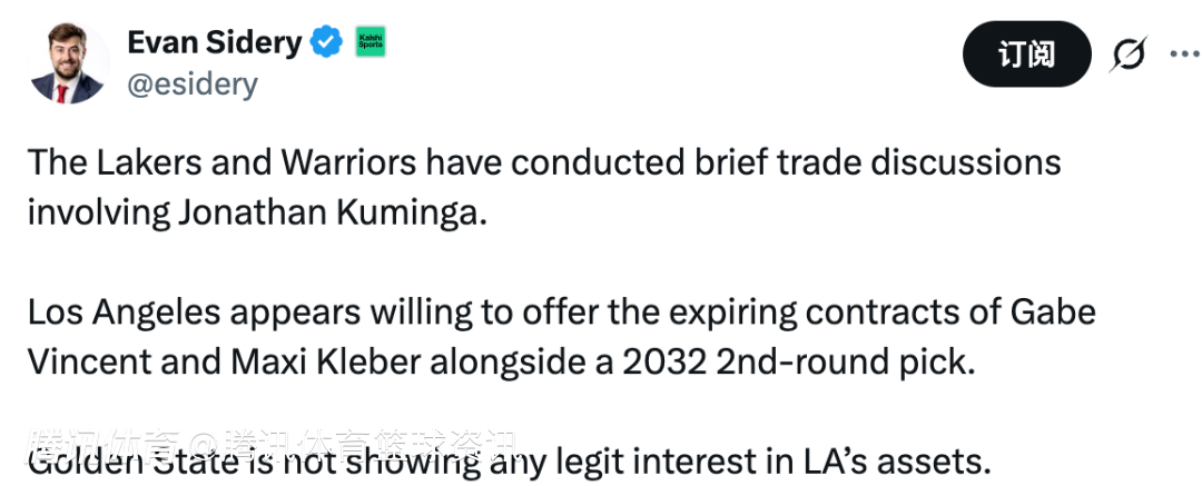 北京时间1月27日,据美记Evan Sidery报道,湖人和勇士就涉及库明加的交易进行了初步洽谈。