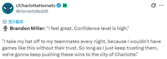 米勒:我感觉棒极了,自信心也拉满了。说实话,每晚的表现都离不开队友的支持,没有他们,没有这份信任,我根本打不出这样的比赛。只要我始终信任队友,我们就会一直朝着目标稳步前进,为夏洛特这座城市拼尽全力。