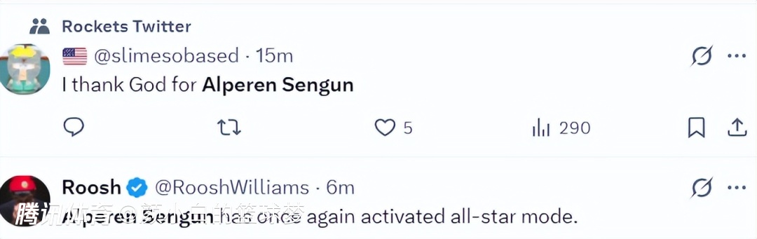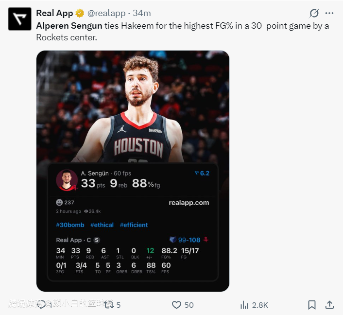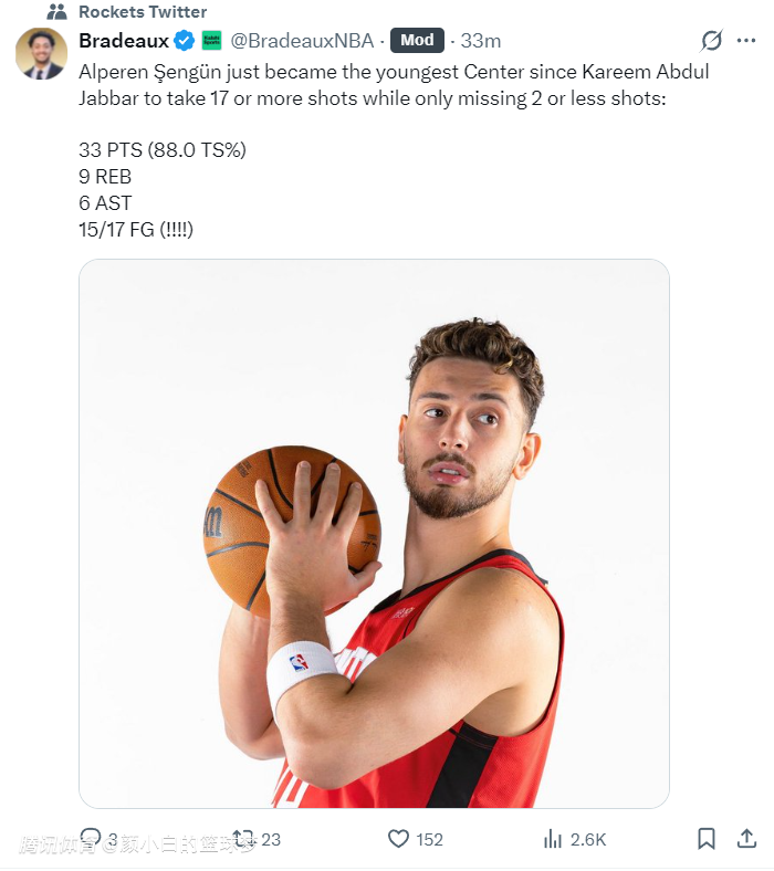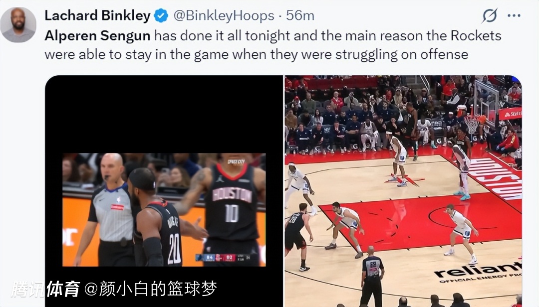 火箭队记兰德里-宾克利赛后写道:申京完成了所有任务,这也是火箭队在进攻陷入困境的情况下仍能拿下比赛的原因。
