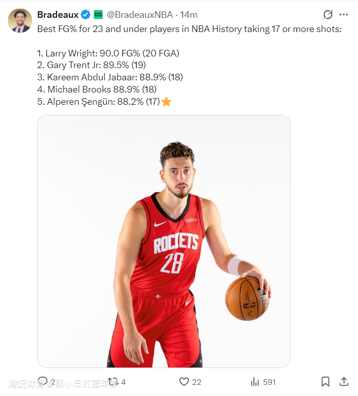 2.申京成为NBA历史上23岁以下出手17次命中率排名第五的球员,前四是拉里-怀特、特伦特、贾巴尔、迈克尔布鲁克斯。