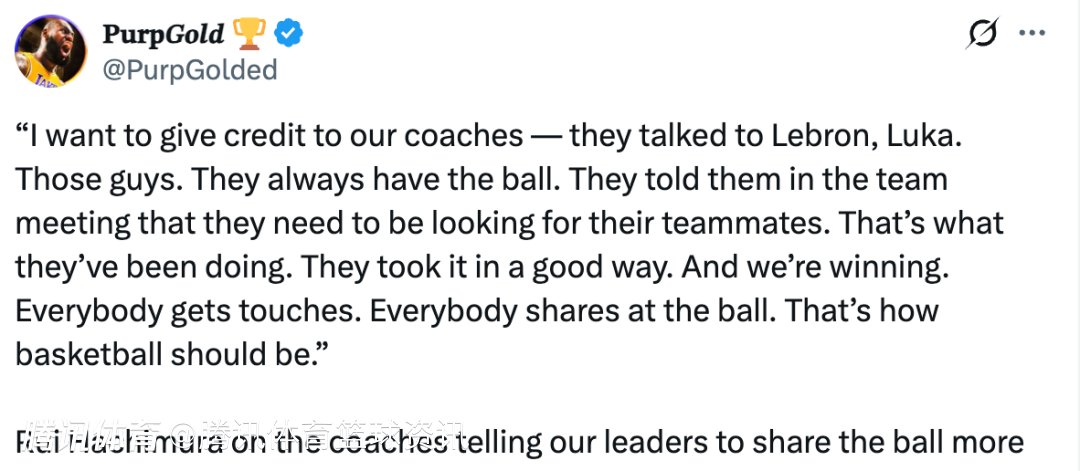 八村垒表示:“我必须要表扬我们的教练组 —— 他们和勒布朗、卢卡这些核心球员谈过话。因为这些球员总是球在手上,教练在球队会议里明确要求他们要多去寻找队友。他们也确实照做了,而且做得非常好。现在我们能赢球,就是因为每个人都能触球,每个人都在分享球权。这才是篮球该有的样子。”