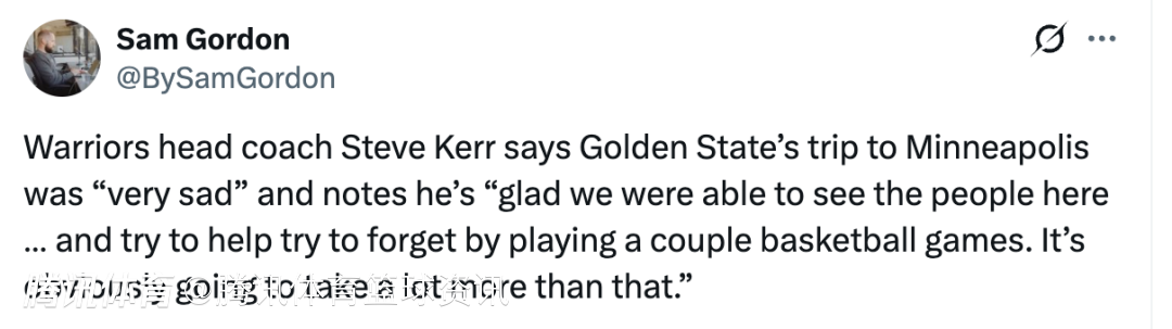谈及明尼苏达当地的枪击事件,科尔表示:”很明显,我们只是这里的客队、旁观者,这并非我们的城市。但我们和森林狼的所有球员都相熟,和芬奇聊过之后,听到了他们的切身感受,还有他们家人的心情;更亲眼近距离看到了街头的民众…… 这场悲剧就发生在离我们咫尺之遥的地方,这一切感觉近乎不真实。过去这几天,一切都太荒诞了。”