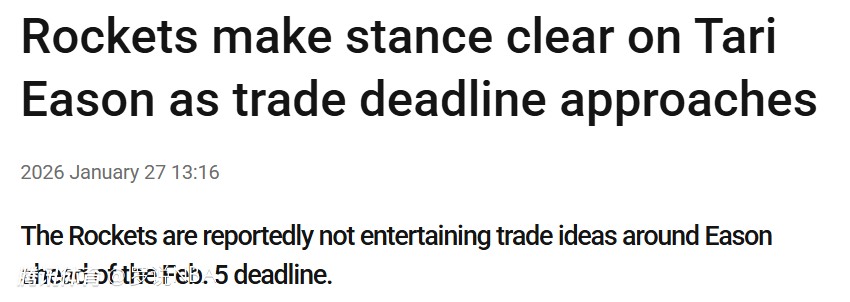 北京时间1月27日,据名记Stein报道,交易截止日来临前,火箭队不考虑任何涉及伊森的交易方案。他们已经回绝所有围绕伊森的交易询价与相关致电。