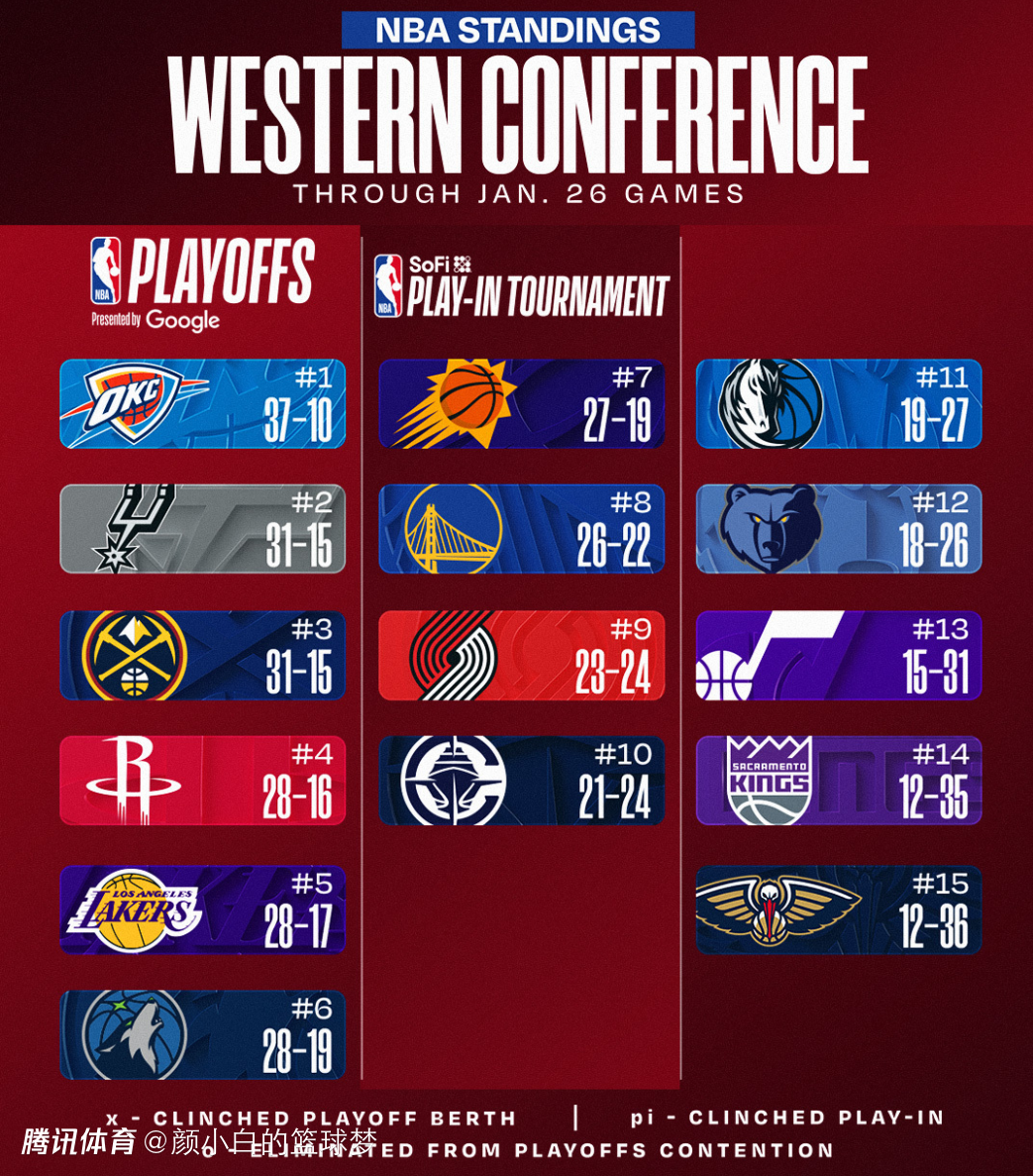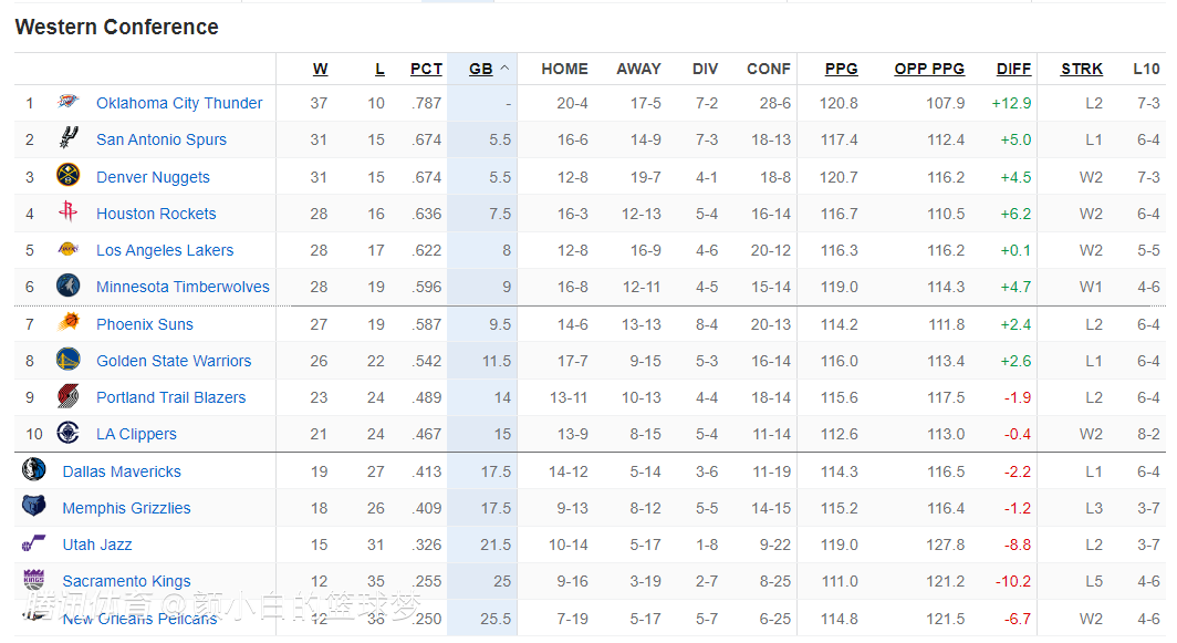 这个比赛日后,西部排名:雷霆、马刺、掘金、火箭、湖人、森林狼、太阳、勇士、开拓者、快船、独行侠、灰熊、爵士、国王、鹈鹕。