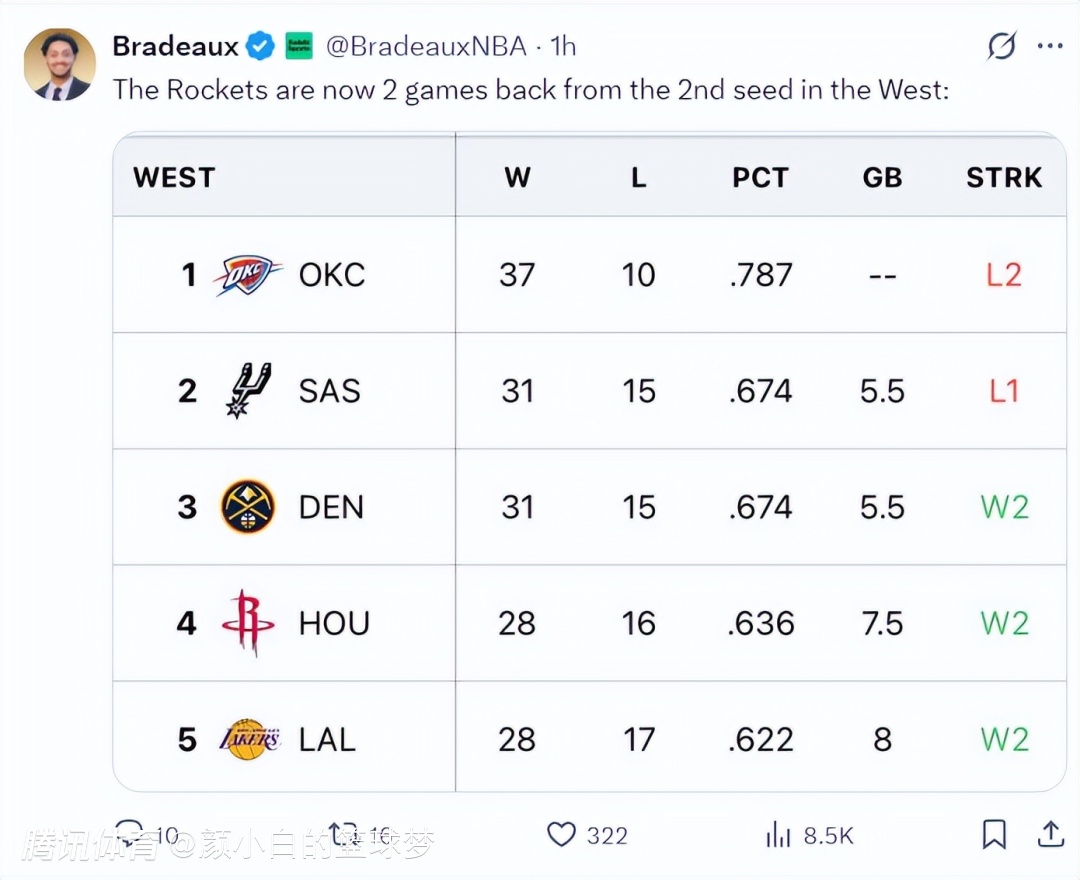 湖人队主场大胜公牛后也拿到二连胜,战绩28胜17负跟火箭只差0.5个胜场,湖人距离西部第二的马刺实际上也只有2.5个胜场。掘金跟马刺的胜场是持平的谁输球谁就会滑落。