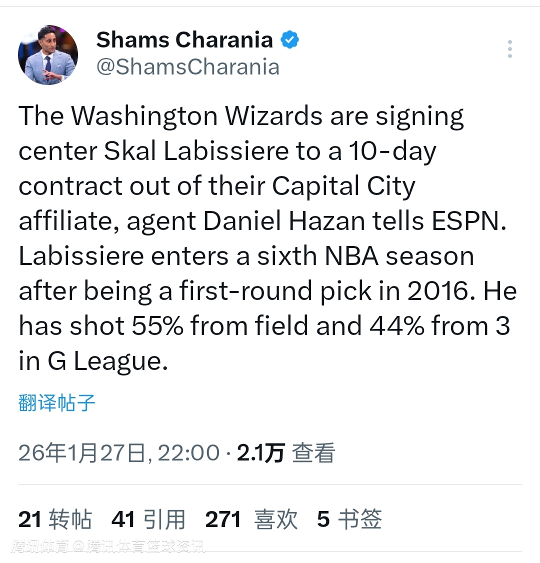 该记者写道:“据经纪人丹尼尔-哈赞向ESPN透露,华盛顿奇才队将从下属球队首都城市队签下中锋斯卡尔-拉比西埃,为其提供一份10天短合同。