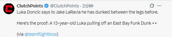 北京时间1月27日,专门聚焦扣篮的媒体teamflightbrothers发布了一条湖人球员卢卡-东契奇在自己13岁时完成胯下扣篮视频,证明了东契奇在击败公牛队的比赛后所说的言论并非是玩笑。