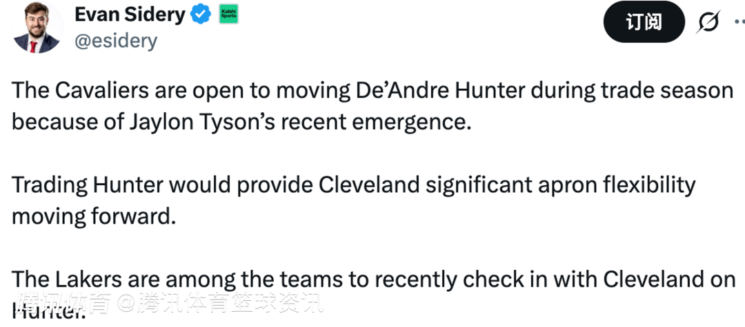 据了解,交易亨特将为骑士队在未来提供更灵活的薪资空间操作,而湖人队是近期向骑士队询问亨特情况的球队之一。