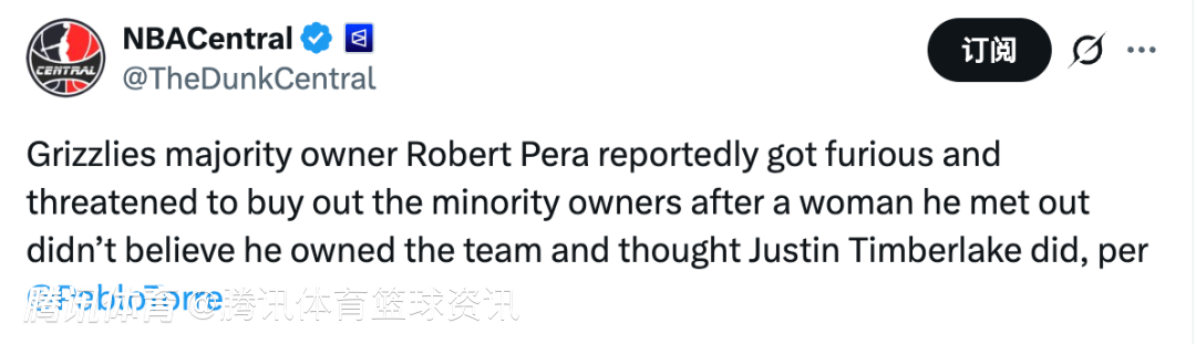 北京时间1月28日,据记者PabloTorre报道,灰熊队大股东罗伯特-佩拉近日勃然大怒,甚至威胁要收购小股东的股份,起因是他在外面遇到一名女子,对方不相信他是球队老板,反而认为贾斯汀-汀布莱克才是灰熊队的拥有者。