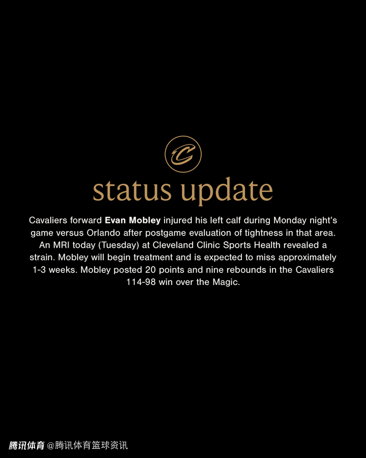 北京时间1月28日,骑士官方发布公告,宣布球队内线埃文-莫布利在战胜魔术的比赛中出现左小腿发紧症状,此后接受核磁共振检查后,确诊为左小腿拉伤。莫布利已启动治疗程序,预计将缺阵1至3周。