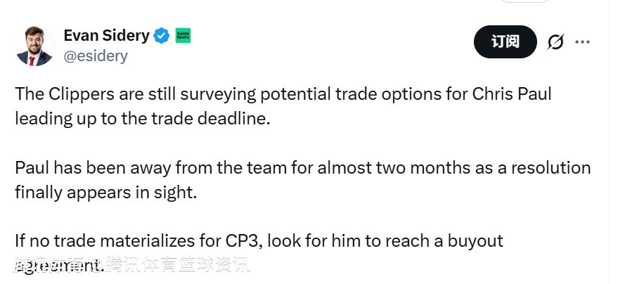 北京时间1月28日,根据记者Evan Sidery的报道,交易截止日前,快船仍在为保罗物色潜在的交易下家。