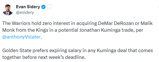 北京时间1月28日,据记者Anthony Slater报道,勇士队在涉及库明加的潜在交易中,完全无意从国王队得到德罗赞或马利克-蒙克。