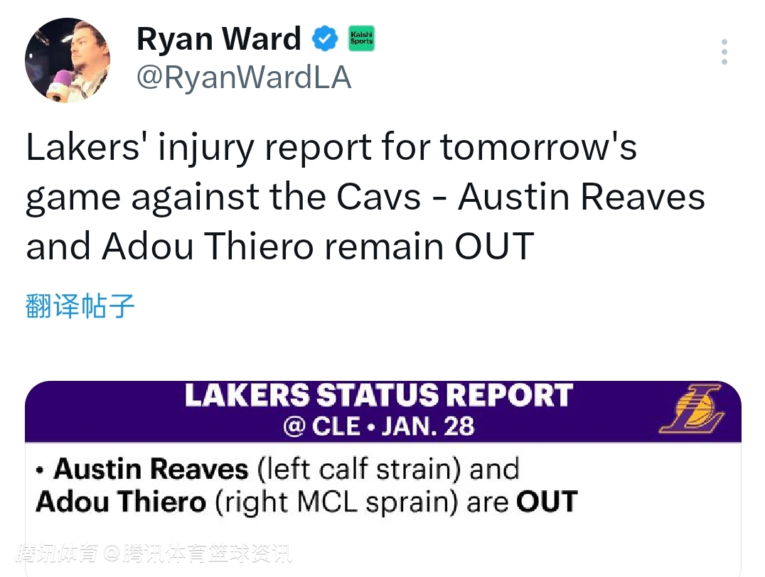 北京时间1月28日,NBA常规赛继续进行,湖人明日将对阵骑士。赛前,湖人方面公布本场比赛最新伤情报告,里夫斯将继续缺阵。