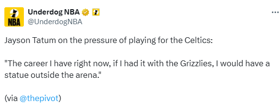 “要知道,每个球员都渴望成为伟大的球员。就拿我现在的职业生涯来说,如果我是在灰熊队打出这样的表现,球馆外说不定早就为我立起雕像了,对吧?可现在我在凯尔特人,追赶的是拉里-伯德这样的传奇,这里的标准要高得多。你绝对不想成为凯尔特人队史里那个另类的球星——明明实力出众,却从未夺冠。毕竟拉塞尔、哈夫利切克、麦克海尔这些前辈,人人都手握总冠军奖杯。”