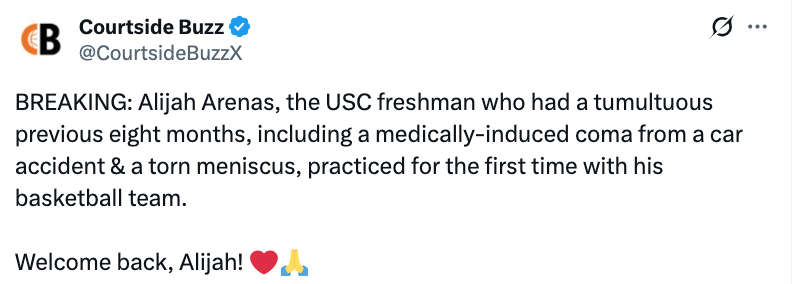 北京时间12月21日,南加州大学新生阿利贾-阿里纳斯在经历了动荡的八个月(包括因车祸陷入药物诱导昏迷、半月板撕裂)后,首次队参加训练。