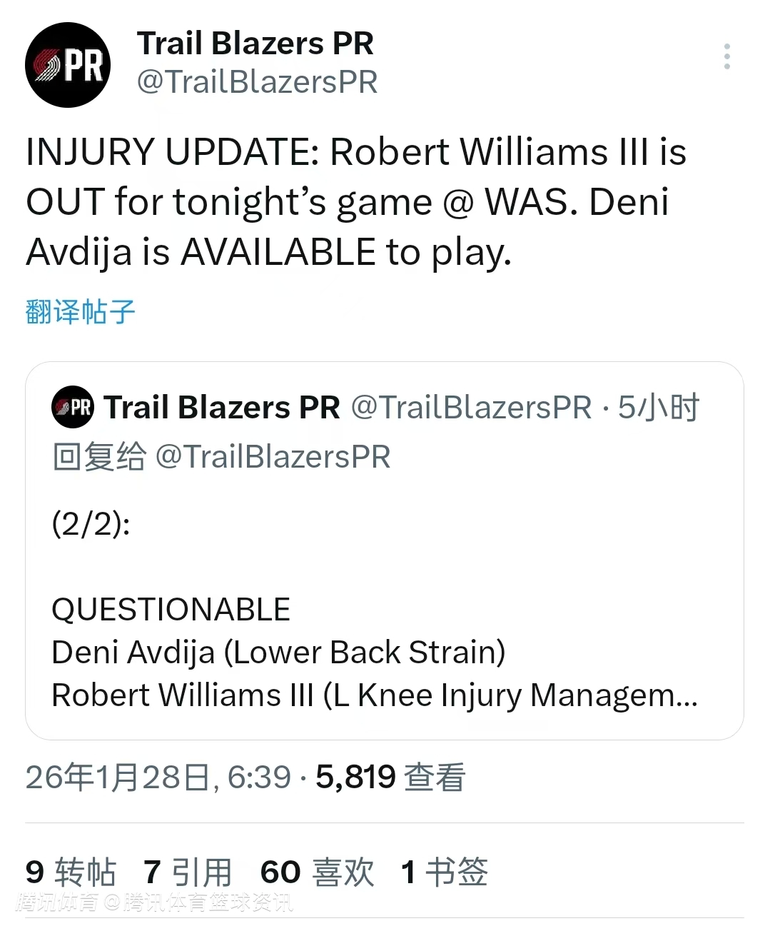 北京时间1月28日,NBA常规赛继续进行,开拓者对阵奇才。赛前,开拓者官方更新球队本场比赛伤情报告,罗伯特-威廉姆斯确认缺阵,阿夫迪亚可以出战。此前,两人均为出战成疑状态。杨瀚森本场有望获得更多上场机会。